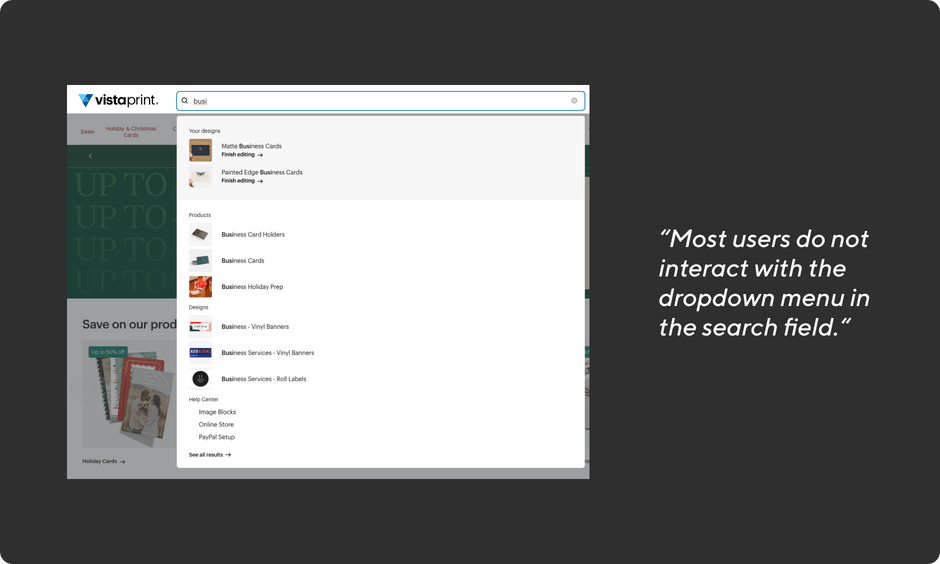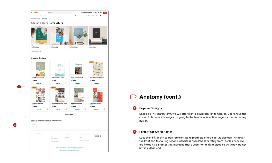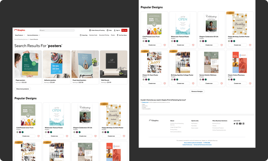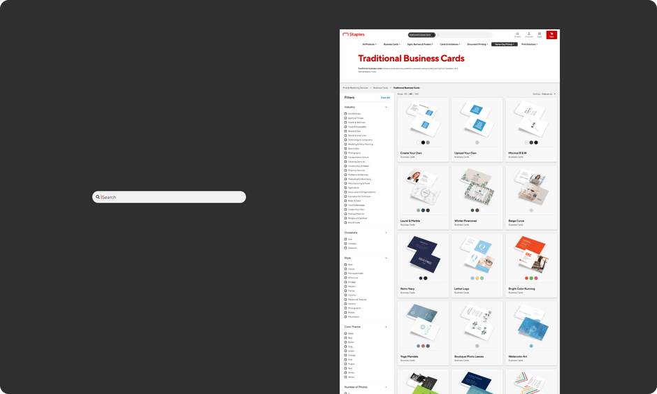 In 2024, I lead the initiative of defining the search experience for Staples Print & Marketing. Research suggested that the search experience deserved its own workflow which had been shared with the template selection workflow until then.